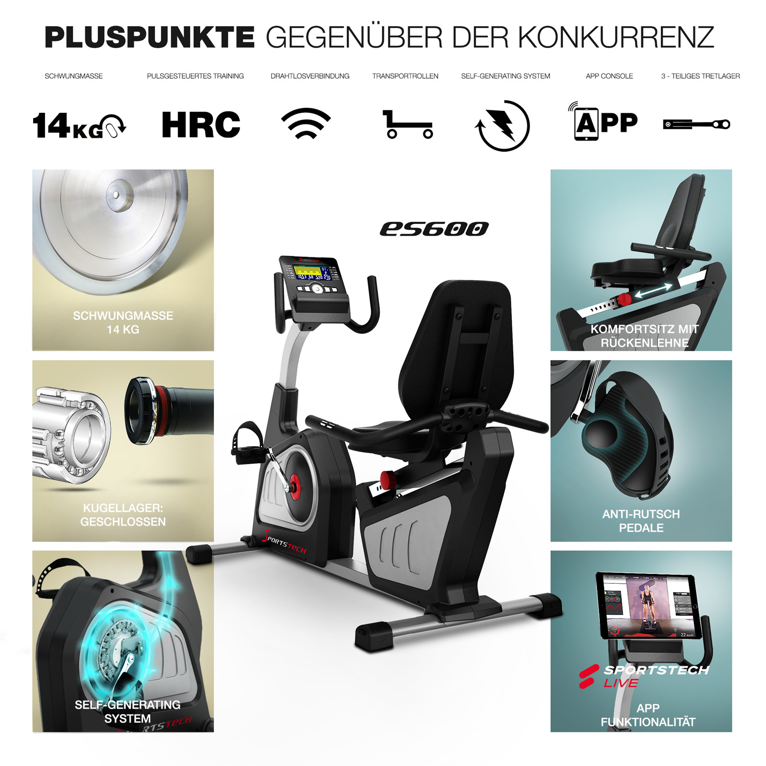 El nombre SPORTSTECH siempre ha sido sinónimo de características innovadoras, un diseño atractivo y una calidad especialmente alta. Por supuesto, el ergómetro profesional ultramoderno ES600 no es una excepción. Además del sistema autogenerador, la función de aplicación y el aspecto sofisticado del ES600, también lo garantiza el eje de pedalier de 3 piezas con rodamiento especial de bolas cerrado. Su ventaja: puede disfrutar de un entrenamiento tranquilo en sus propias cuatro paredes y, gracias a su enorme durabilidad, ¡podrá disfrutar de su nuevo producto favorito durante un tiempo especialmente largo!